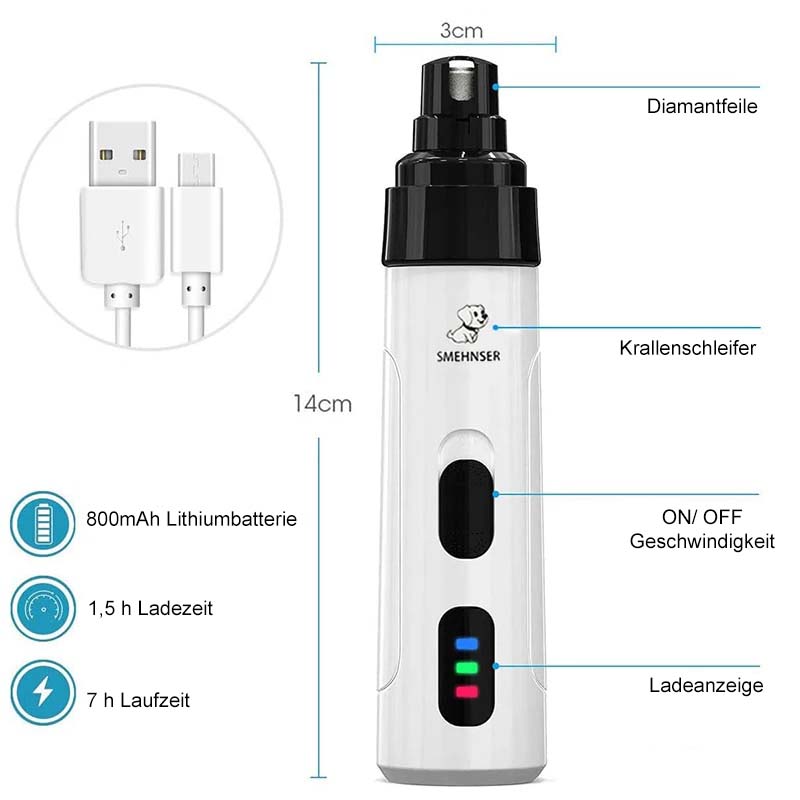 Zu lange Krallen können den Hund beim Gehen behindern und zu Schmerzen führen. Wenn sie sich beim Gassigehen nicht von selbst abnutzen, ist unser elektrischer Krallenschleifer die perfekte Lösung. Mit ihm ist eine schmerzfreie und schnelle Behandlung möglich, ohne, dass du viel Geld für einen Tierarzt ausgeben musst. Er ist besonders leise, um zurückhaltende Hunde nicht zu verängstigen und funktioniert nach der Aufladung kabellos. Dadurch ist er flexibel einsetzbar und kann überallhin mitgenommen werden. Er hat zwei Geschwindigkeitsstufen, um ein ideales Kürzen der Hundekrallen zu gewährleisten.