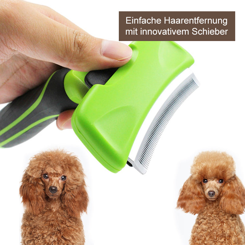 Unsere Fellbürste entfernt zuverlässig und schonend lose Hundehaare. Sie ist der perfekte Helfer während des Fellwechsels im Sommer und Winter und reduziert Haarausfall nachhaltig um bis zu 99%. Dank der langen Zacken kannst du optimal das Unterfell deines Vierbeiners pflegen, ohne dabei das Deckhaar zu beschädigen. Durch die gebogene Form ist die Haarentfernung für deinen Hund viel angenehmer und sein Fell wird schon bald gesund glänzen. Das beste an unserer Fellbürste: Du kannst dank des innovativen Schiebers einfach die Haare aus der Bürste entfernen, ohne sie stundenlang einzeln rauszufriemeln.