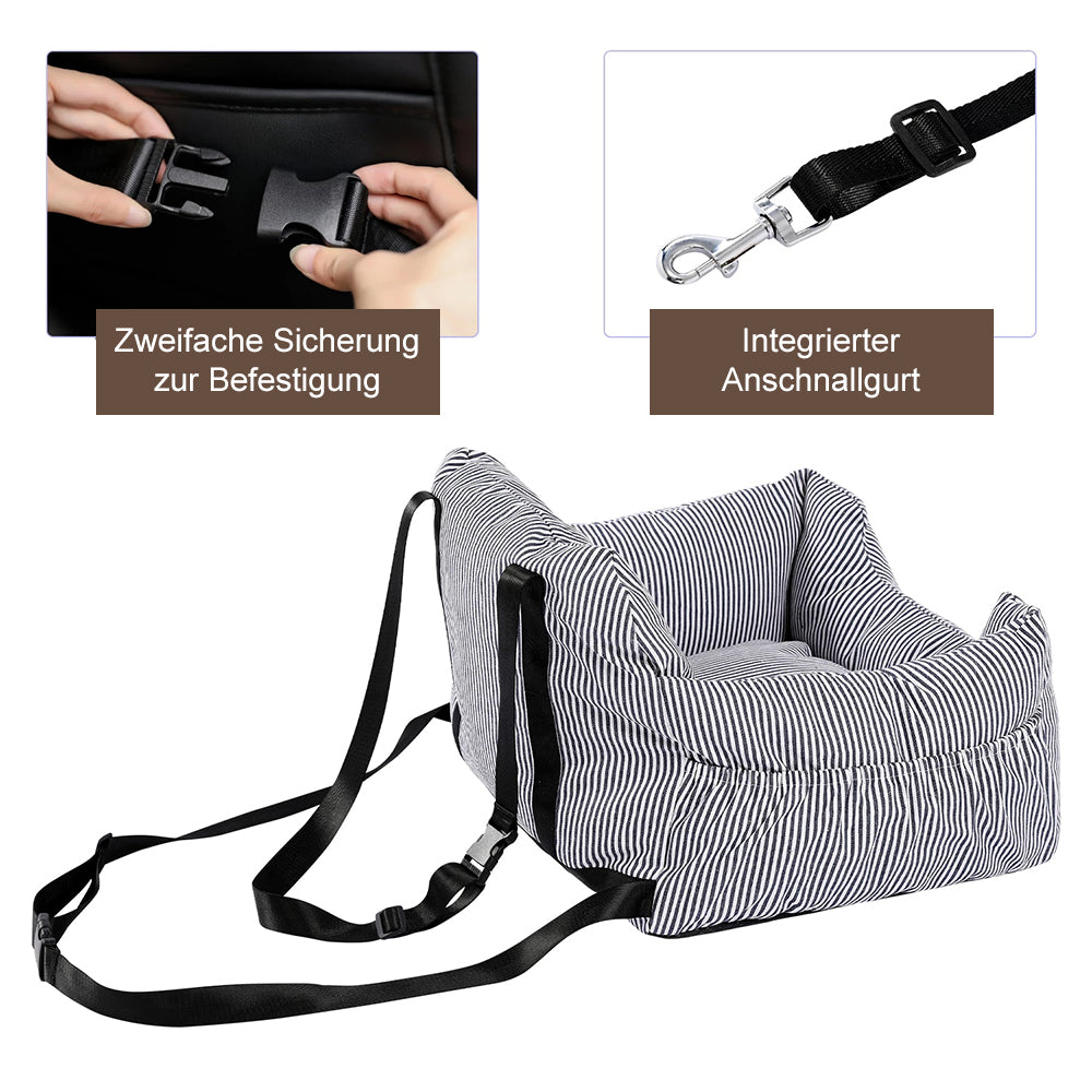 Unser Hunde Autositz sorgt dafür, dass dein Liebling es während langen Autofahrten gemütlich hat und gleichzeitig gut gesichert ist. Er besitzt einen integrierten Anschnallgurt sowie eine zweifache Sicherung zur Befestigung am Autositz. Das weiche Innenfutter und die gepolsterten Ränder sorgen für maximalen Komfort und geben ängstlichen Hunden ein sicheres, geborgenes Gefühl. So sind du und dein Vierbeiner immer bequem und gut geschützt auf der Straße unterwegs.