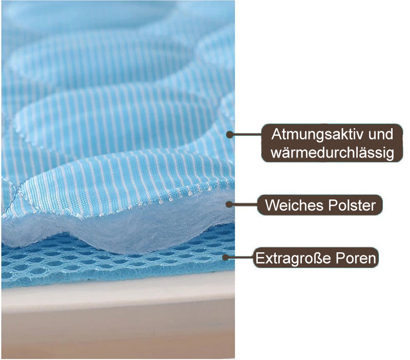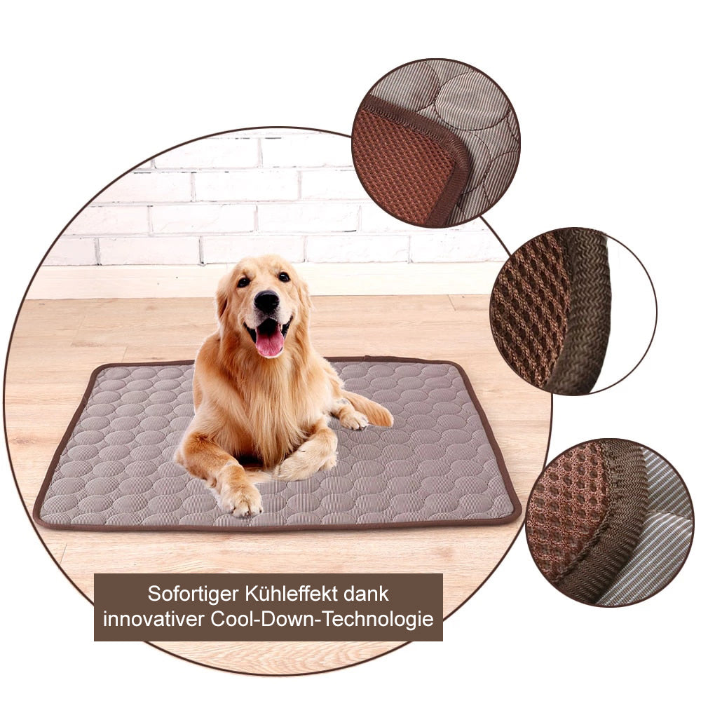 Mit unserer Hundematte schaffst du an heißen Tagen einen kühlen Ort für deinen Vierbeiner. Haustiere leiden im Frühling und Sommer oft unter den hohen Temperaturen, was zu Stress und Schlafproblemen führen kann. Unsere Matte besitzt eine innovative Cool-Down-Technologie und kühlt sich durch ihre extragroßen Poren selbst ab. Sie besteht aus einem super weichen Material und kann einfach ins Hundebett oder direkt auf den Boden gelegt werden. So kommt dein Hund entspannt und abgekühlt durch die warme Jahreszeit und kann besser schlafen.
