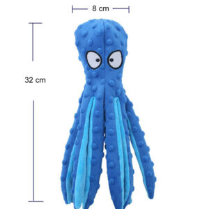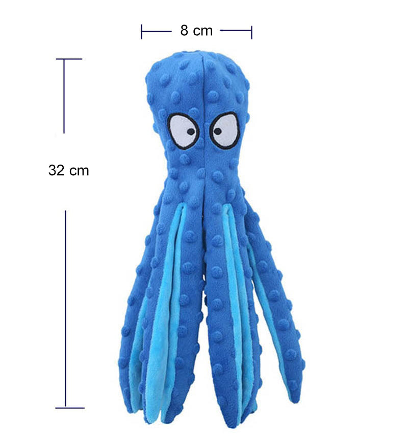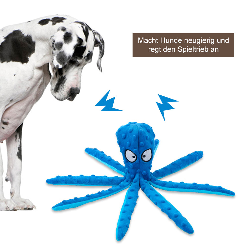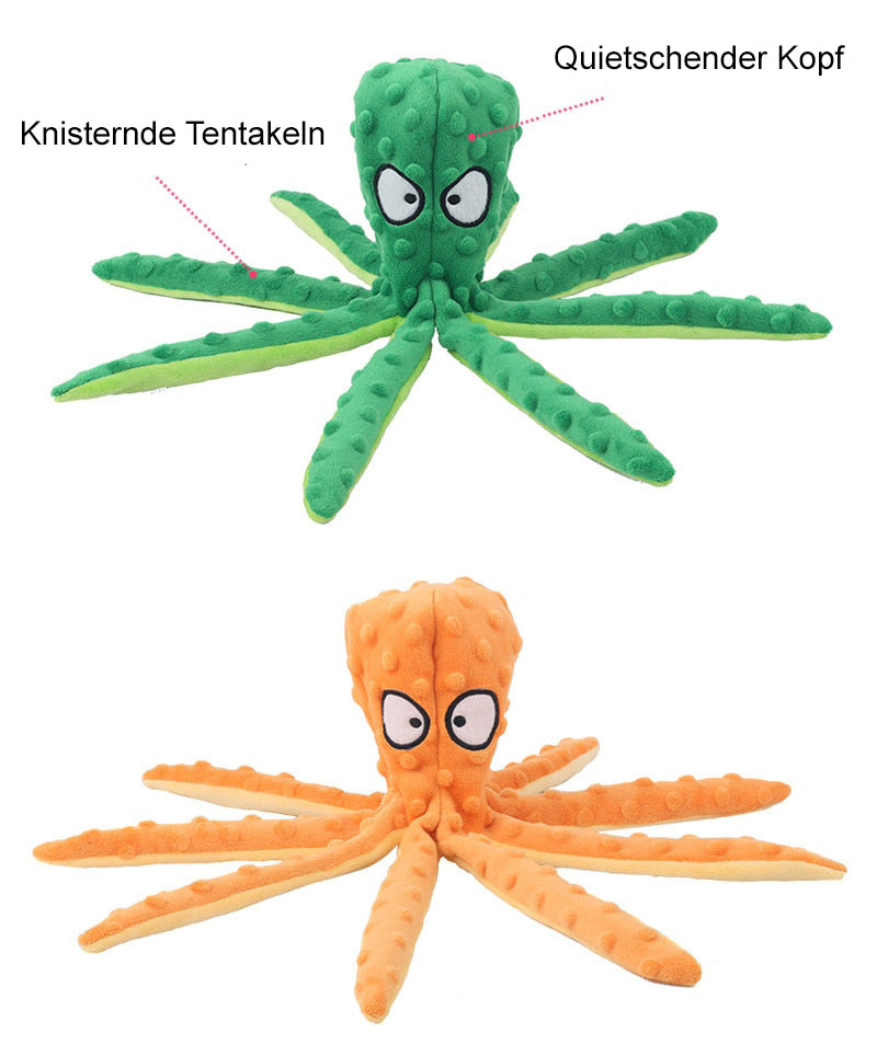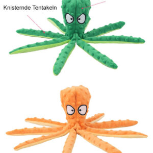 Unser Oktopus mit Knistereffekt ist kein normales Kuscheltier. Er hat eine ganz besondere Knisterfolie in seinen Tentakeln integriert. Während das Geräusch für uns Menschen als nicht störend wahrgenommen wird, macht es Hunde ganz verrückt und animiert sie zum Spielen, Fangen und Apportieren. So sorgt der niedliche Oktopus für ausgelassene Stunden, egal ob bei alleiniger Beschäftigung oder beim gemeinsamen Spielen. Dank seiner weichen, plüschigen Oberfläche lädt er außerdem zum Kuscheln und Anschmiegen ein und könnte der neue beste Freund deines Hundes werden.