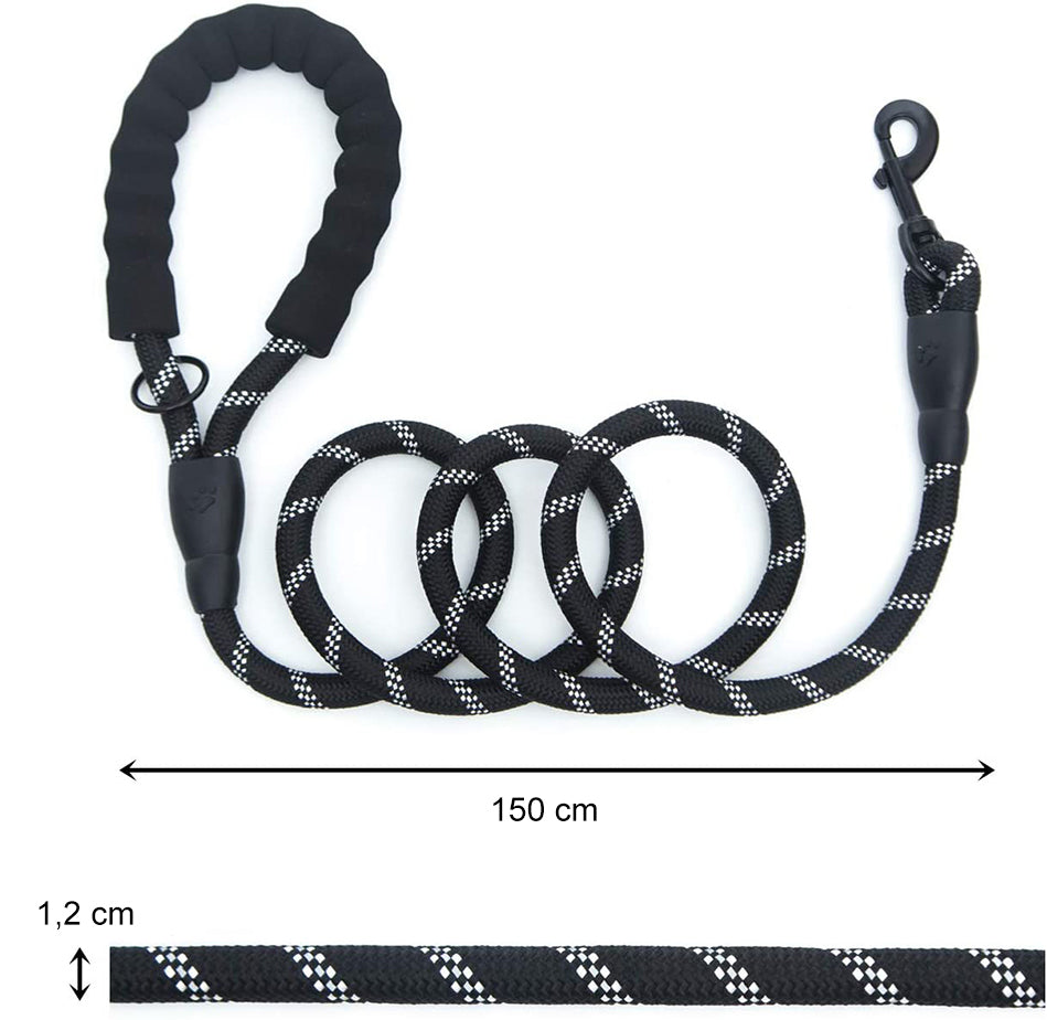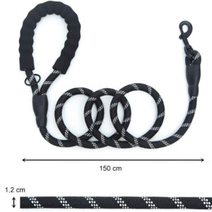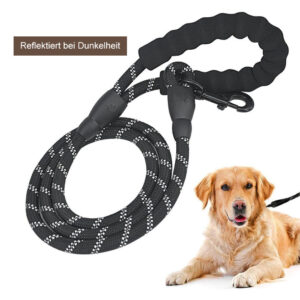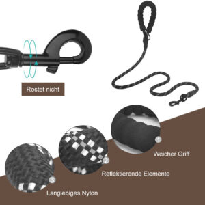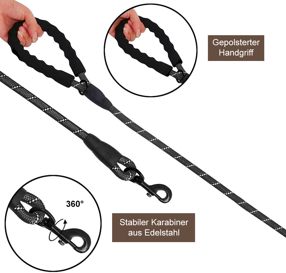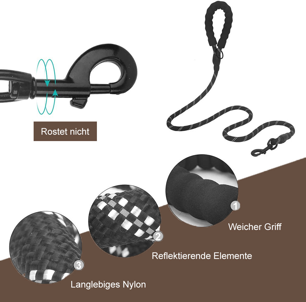 Diese Stoffleine ist 1,5 Meter lang und besteht aus stabilem und langlebigem Nylon. Sie ist mit reflektierenden Elementen versehen, sodass du und dein Vierbeiner auch bei Nacht von Autofahrern erkannt werdet. Um die Führhand zu schonen, ist der Griff mit einem Polster verstärkt, das für maximalen Tragekomfort während dem Gassigehen sorgt. Der Wirbelkarabiner aus Edelstahl ist extrem robust und stabil und garantiert einen sicheren Halt auch bei stärkerem Zug auf die Leine. Wind und Wetter sind für unsere Reflektierende Stoffleine kein Problem.