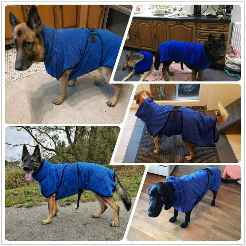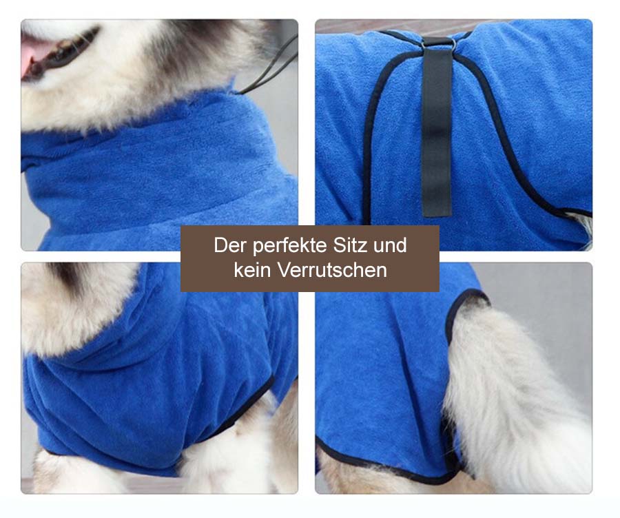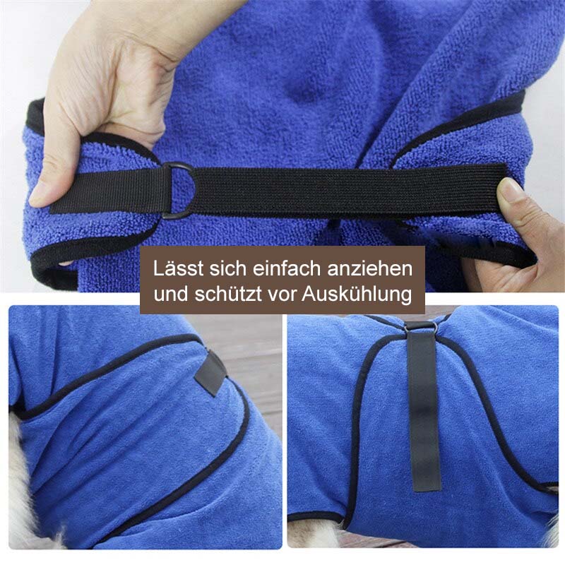 Unser Hunde Bademantel ist gerade im Herbst und Winter, aber auch im Sommer nach dem Baden ein echter Lebensretter. Er besteht aus Mikrofaser und ist dadurch super leicht und saugstark. Er nimmt Feuchtigkeit im Fell schnell auf, schützt deinen Hund vor dem Auskühlen und verhindert, dass er sich mitten in der Wohnung schüttelt und Wasser sowie Schmutz verteilt. Dank des elastischen Gurts und der Öffnung im Rutenbereich verrutscht unser Hunde Bademantel nicht und ist immer ein praktischer Begleiter. Hiermit ist dein Vierbeiner in kürzester Zeit wieder trocken!