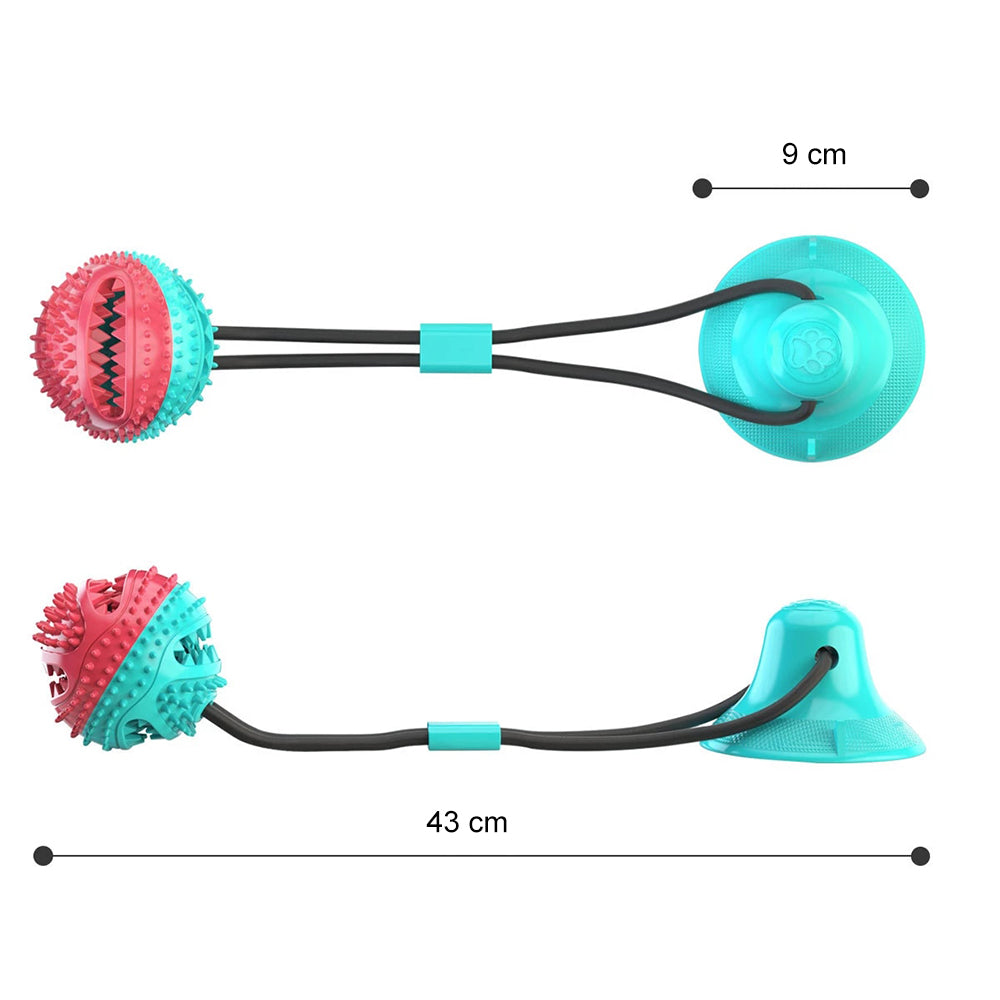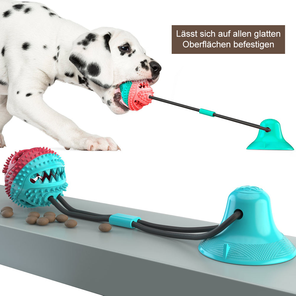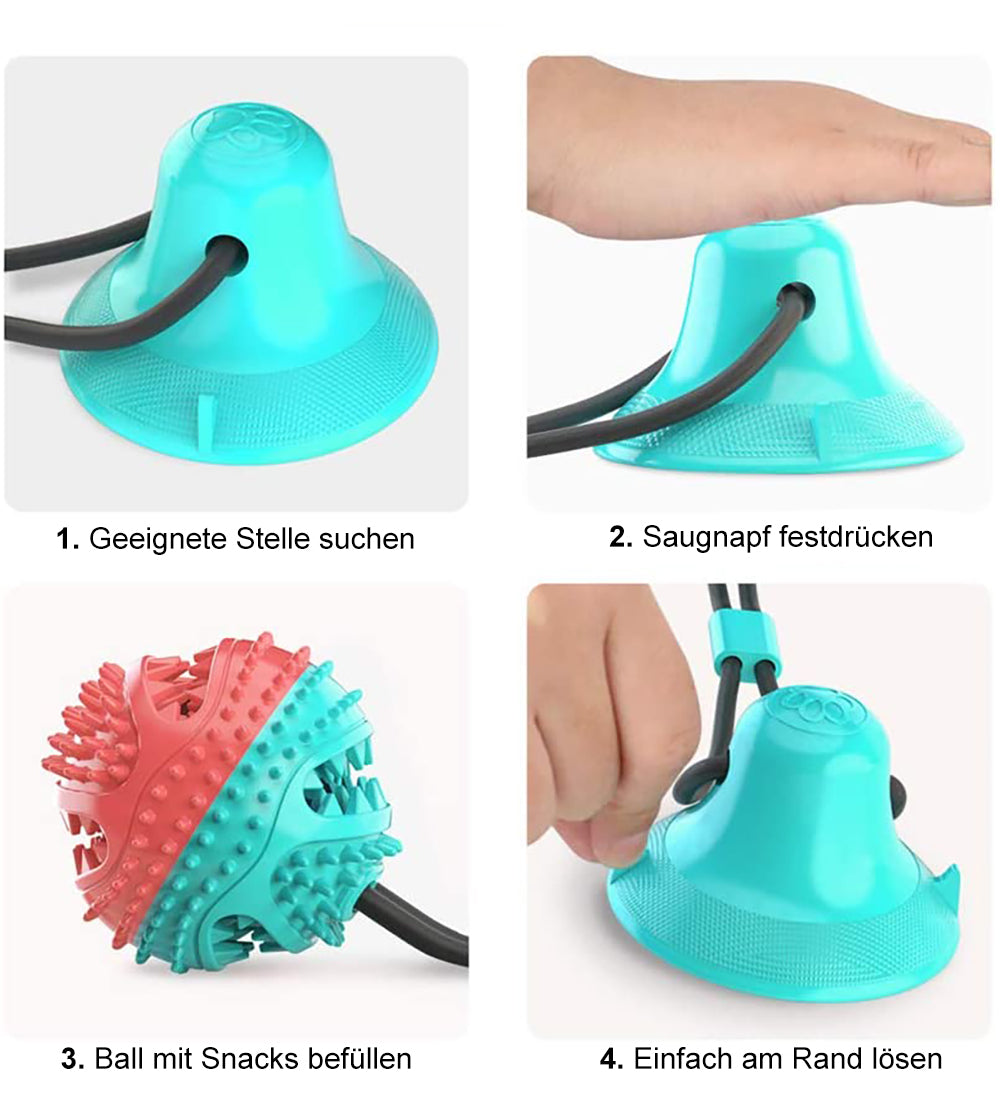 Dein Hund liebt Zerrspiele? Dann ist unser Spielball mit Saugnapf das perfekte interaktive Spielzeug für deinen Vierbeiner. Es kann auf allen glatten Oberflächen befestigt werden und verfügt über eine extra Öffnung, in der sich Leckerlis als Lockmittel platzieren lassen. Das Material des Balls ist ungiftig und besitzt Noppen, durch die während des Spielens automatisch eine natürliche Zahnreinigung erfolgt. Dank des Saugnapfs kann dein Liebling sich stundenlang allein beschäftigen und austoben und ihm wird dabei garantiert nie langweilig.