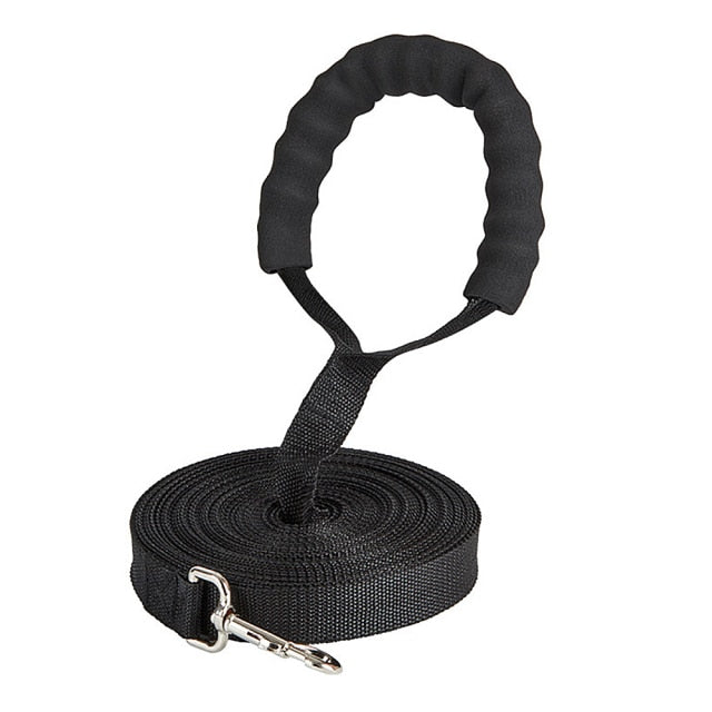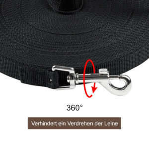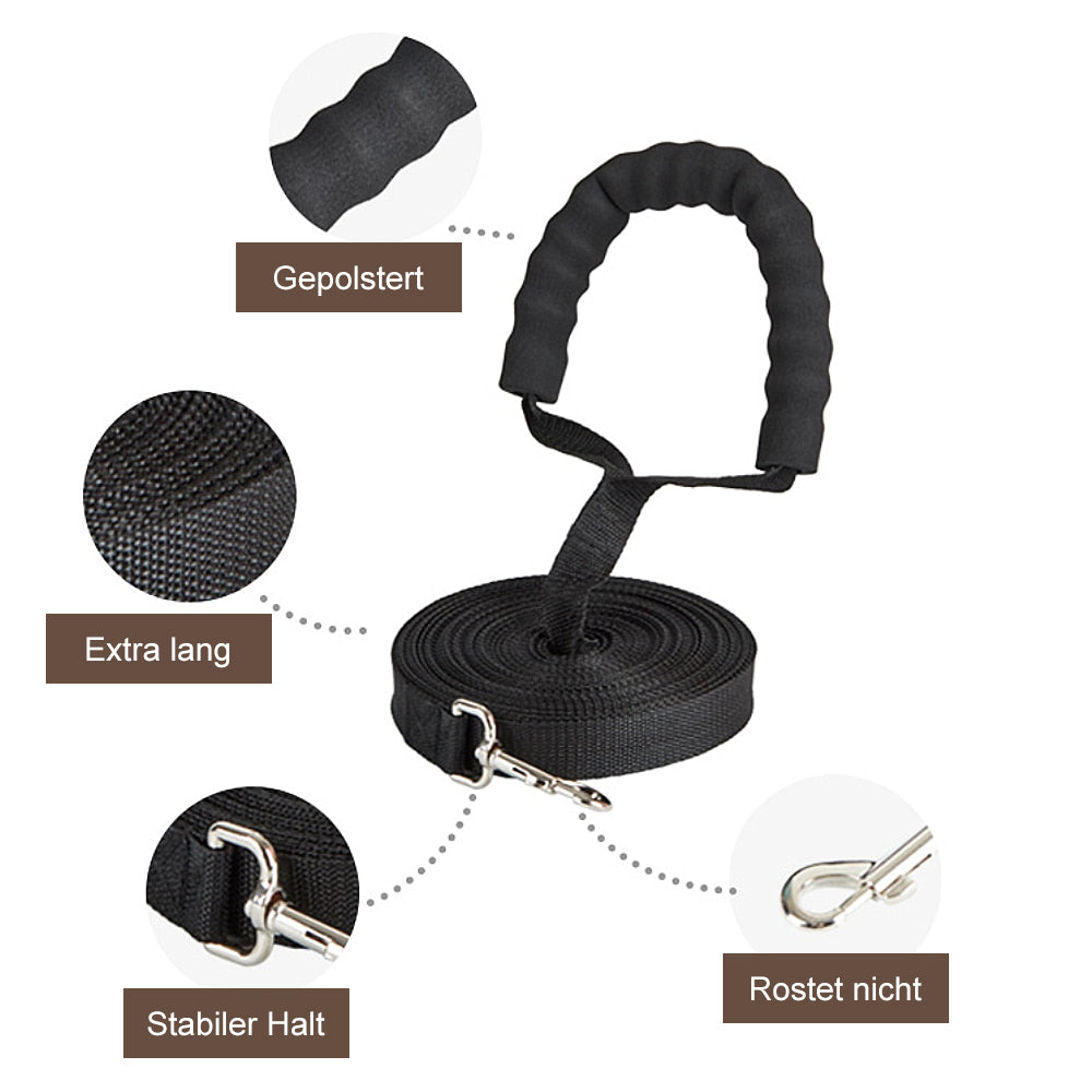Unsere wasserfeste Schleppleine gibt es wahlweise mit 10 m oder 20 m Länge. Sie eignet sich perfekte für lange Spaziergänge zu jeder Jahreszeit, bei denen dein Hund die Gegend weiträumig erkunden kann. Das Material aus Nylon ist extrem stabil und wasserabweisend. Dein Vierbeiner kann damit schwimmen gehen und Spaß haben, während du aus der Ferne zusiehst und die Kontrolle behältst. Im Gegensatz zu herkömmlichen Modellen besitzt diese Leine eine gepolsterte Schlaufe für maximalen Tragekomfort.